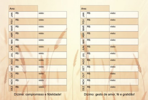 Carteirinha para controle da entrega do dízimo com espaços para preenchimento do valor, data e visto;